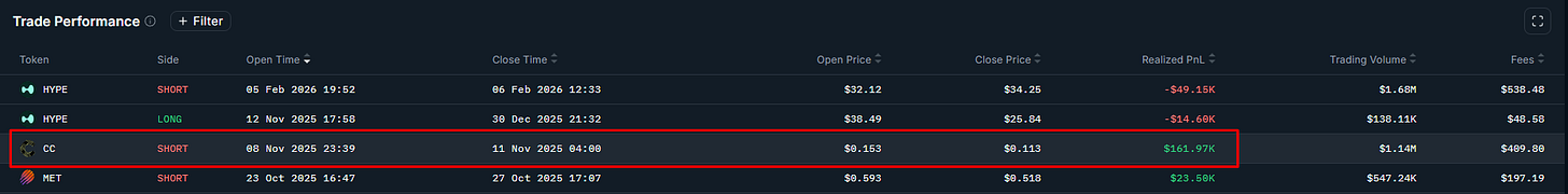 Изначально кошелек заработал $800К на шортах $CC, $PUMP, $BTC, $MET после чего ночью уже раздал весь профит и вышел в безубыток.