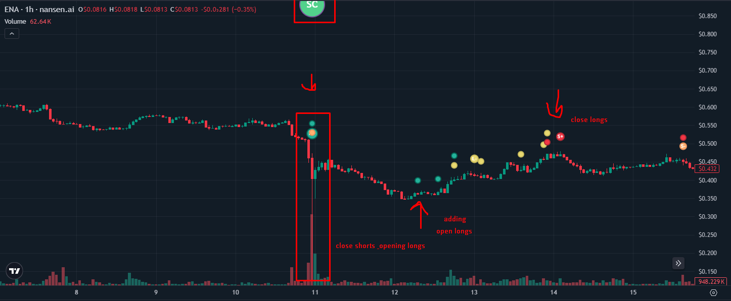 $ENA - на падении фиксирование шортов и плавный набор лонгов. На следующий день начали добирать лонги и через сутки начали фиксировать лонги в 40%.