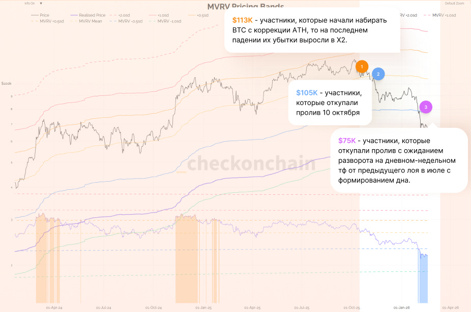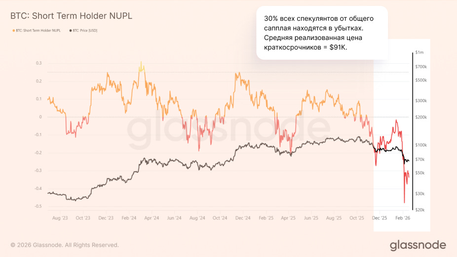 Средняя реализованная цена 30% всех краткосрочников от общего сапплая BTC = $91К находятся в убытках.