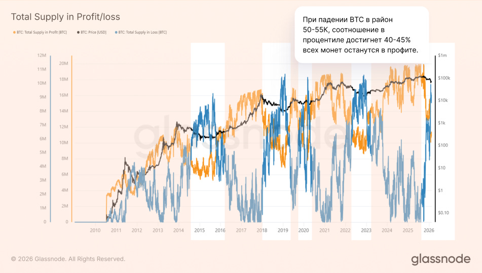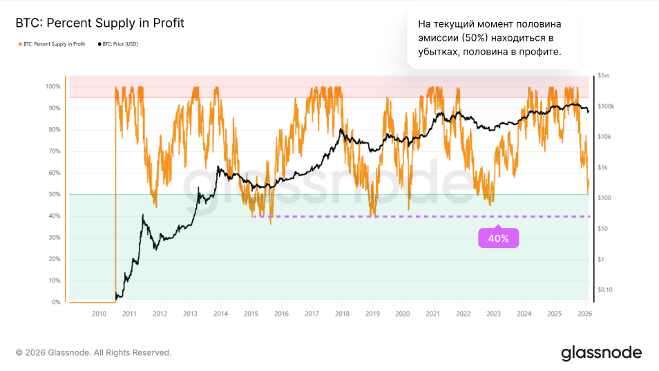 В прошлых циклах рынок достигал дна, когда 2/3 холдеров Биткоина оказывались в убытках.
