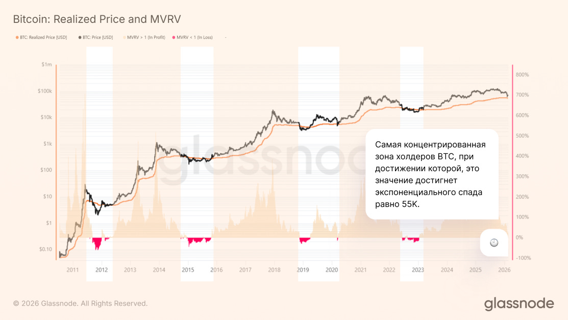Учитывая все циклы, максимальная капитуляция и дно всегда начиналась, когда цена достигала ниже реализованной цены и реализованной цены долгосрочников, в нашем случае это зона 55-40К.